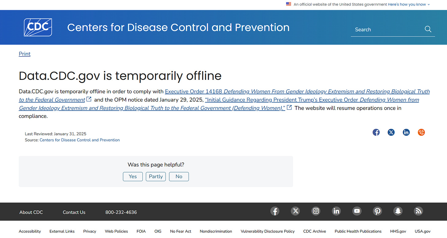 Update: 17:51 GMT 1/02/25. https://data.cdc.gov/ is now back up, with no trace of the landing "info" page that was there before. The datasets highlighted in the piece are still inaccessible.